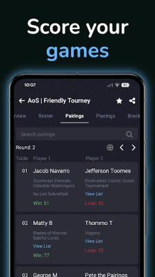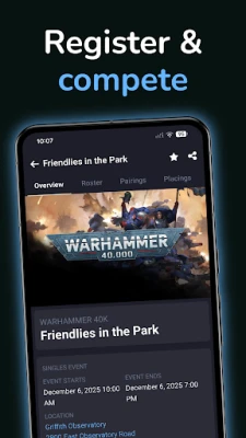 Az esemény során a Best Coast Pairings a te megbízható segítőd. Könnyedén megtalálhatod asztalkiosztásaidat, és rögzítheted a köreredményeket közvetlenül a telefonodról, elkerülve a sorban állást és a papírmunkát. Kövesd nyomon saját előrehaladásodat, ellenőrizd pontszámaidat és helyezésedet valós időben, vagy figyeld barátaid teljesítményét. Mindez a regisztrációtól a végső eredményekig ingyenesen elérhető minden olyan játékos számára, aki egy Best Coast Pairings által szervezett eseményen vesz részt.