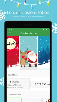 Készüljön fel az év legvarázslatosabb időszakára a Christmas Countdown alkalmazással! Fedezze fel a karácsony varázsát már hetekkel az ünnep előtt, és élje át a várakozás izgalmát minden egyes napon. Válasszon a gyönyörűen megtervezett témák széles választékából, amelyek Mikulással és rénszarvasaival, csillogó karácsonyfákkal vagy akár egy vidám hóemberrel örvendeztetik meg a szívét. Merüljön el a klasszikus karácsonyi dallamok békés hangulatában, mint például a "Deck the Halls" és a "We Wish You a Merry Christmas", miközben a visszaszámláló képernyőn finoman hulló hópelyhek teszik még meghittebbé a pillanatot. A Christmas Countdown teljesen hirdetésmentes élményt kínál, így semmi sem vonja el a figyelmét az ünnepi készülődésről.
