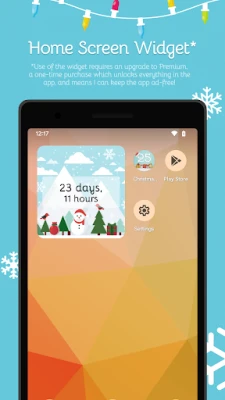 Emelje még magasabb szintre az ünnepi élményt a prémium frissítéssel! Ez a különleges csomag egy praktikus visszaszámláló widgetet tartalmaz, amely lehetővé teszi, hogy gyorsan és egyszerűen ellenőrizze, mennyi idő van még karácsonyig, közvetlenül a főképernyőről. Bővítse karácsonyi zenei gyűjteményét olyan népszerű dallamokkal, mint a "Jingle Bells" és a "Silent Night", és válasszon további exkluzív háttérképek és egy egyedi visszaszámláló stílus közül, hogy tökéletesen személyre szabja az alkalmazást. A Christmas Countdown fejlesztője nagy gondot fordított arra, hogy Önnek a legszebb és leginkább személyre szabható karácsonyi visszaszámlálót nyújthassa, és örömmel fogadja visszajelzéseit, hogy az alkalmazás évről évre még jobb lehessen.
