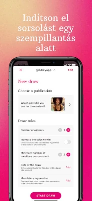 Közösségi média nyereményjátékot szervezni sosem volt még ilyen egyszerű és megbízható! A lukkyapp professzionális platformot kínál, amellyel percek alatt, átláthatóan bonyolíthatod le Instagram és Facebook nyereményjátékaidat. Felejtsd el a manuális sorsolás nehézségeit és a hitelességi aggályokat. Egyszerűen jelentkezz be Facebook vagy Instagram üzleti/alkotói fiókoddal a Facebook rendszerén keresztül, és máris készen állsz a tökéletes kampány elindítására.