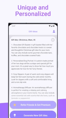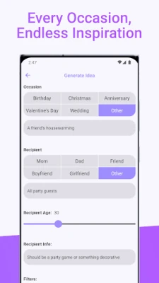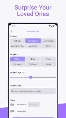 Az Ajándék Ötletek a legmodernebb mesterséges intelligencia algoritmusokat veti be, hogy pontosan az Ön igényeire szabott javaslatokat hozzon létre. Egyszerűen adja meg az alkalmat, az ajándékozott korát és viszonyát, a kívánt költségvetést, valamint bármilyen egyedi érdeklődési kört, és nézze meg, ahogy kreatív lehetőségek tárháza nyílik meg Ön előtt. Legyen szó egy mérföldkő születésnapról, egy dédelgetett évfordulóról, egy ünnepi alkalomról vagy egy egyszerű elismerésről, az alkalmazás garantálja, hogy minden ötlet olyan egyedi lesz, mint az, aki kapja, felejthetetlen pillanatokat biztosítva.