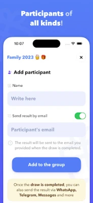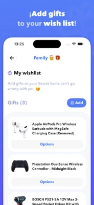 Miután beállítottad a csoport részleteit, hívj meg mindenkit, akivel megosztanád az ünnepi hangulatot! Családtagjaid és barátaid egyszerűen csatlakozhatnak e-mail címük megadásával, vagy a csoportkód megosztásával olyan népszerű platformokon, mint a WhatsApp, Facebook, Messenger, Instagram, e-mail vagy akár SMS. A résztvevők számára lehetőséget biztosítunk, hogy saját kívánságlistát állítsanak össze, így titkos ajándékozójuk pontosan tudni fogja, minek örülnének a legjobban, garantálva a találó és személyes ajándékokat.